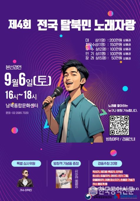 한국공익신문 관리자 기자 | 통일부 남북통합문화센터(서울시 강서구 소재)는 9월 6일 오후 4시, '전국 탈북민 노래자랑'을 개최한다.
