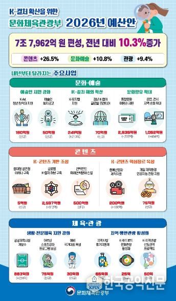 한국공익신문 관리자 기자 | 문화체육관광부 2026년 예산안은 7조 7,962억 원으로 2025년 대비 10.3%(7,290억 원) 증가했다. 이는 2020년 이후 가장 큰 폭의 증가로, 이를 통해 ‘케이-컬처’의 성장을 가속화하고 국민들의 ‘케이-컬처’ 향유 기회를 더욱 확대할 것으로 기대된다.
