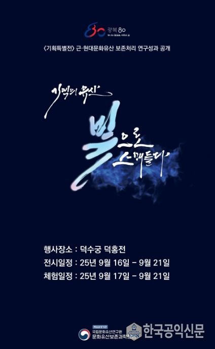 한국공익신문 관리자 기자 | 국가유산청 국립문화유산연구원 문화유산보존과학센터는 광복 80주년을 맞아 오는 9월 16일부터 21일까지 6일간 덕수궁 덕홍전(서울 중구)에서 광복과 독립운동의 상징적 유물이 보존처리를 통해 어떻게 되살아났는지 그 과정을 영상과 사진으로 조명한 기획전 '기억의 유산, 빛으로 스며들다'를 개최하고, 9월 16일 오후 2시에 개막식을 개최한다.
