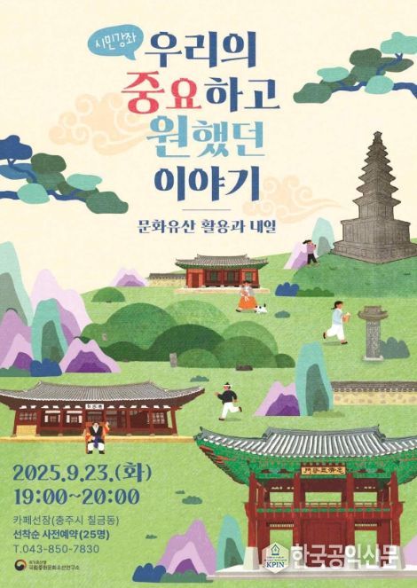 한국공익신문 관리자 기자 | 국가유산청 국립문화유산연구원 국립중원문화유산연구소는 오는 23일 오후 7시 충주 탄금공원 인근에서 ‘우리의 중원(중요하고 원했던) 이야기’ 하반기 시민강좌를 개최한다.