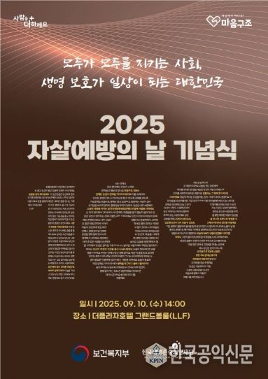 한국공익신문 관리자 기자 | 보건복지부와 한국생명존중희망재단(이사장 황태연)은 자살 예방의 날을 맞아 9월 10일 오후 2시에 서울 더플라자호텔 그랜드 볼룸에서'2025년 자살예방의 날 기념식'을 개최했다.