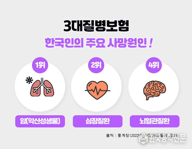 한국공익신문 관리자 기자 | 흔히 3대질병이라 일컫는 암, 심혈관질환, 뇌혈관질환은 통계청 발표자료에 따르면 한국인의 주요 사망원인 중에서 3위 폐렴을 제외하고 1~4위를 차지하고 있으며, 이전부터 지금까지도 살면서 가장 먼저 대비해야 하는 치명적인 질병으로 강조되고 있다. 이러한 중대질병에 대비하기 위하여 상기 세가지 치명적인 질병을 집중보장하는 3대질병진단비보험을 많이 가입하고 있다. 3대진단비보험은 각각의 질병을 중점적으로 보장하면서도 가입자 특성에 맞는 특약을 추가함으로써 종합건강보험으로도 활용할 수가 있다.