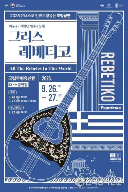 한국공익신문 관리자 기자 | 국가유산청 국립무형유산원은 오는 9월 26일과 27일 총 3회에 걸쳐 국립무형유산원(전북 전주시) 얼쑤마루 대공연장에서 유네스코 인류무형유산 초청공연 '그리스 레베티코'를 개최한다.