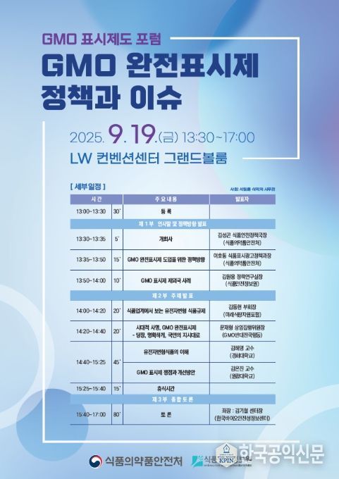 한국공익신문 관리자 기자 | 식품의약품안전처는 식품안전정보원과 공동으로 ‘GMO 완전표시제 정책과 이슈’를 주제로 하는 포럼을 9월 19일 LW컨벤션(서울특별시 중구 소재)에서 개최한다고 밝혔다.