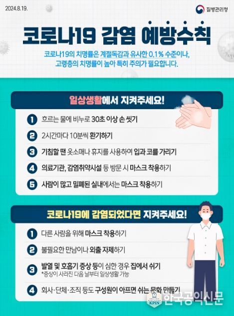 임승관 질병관리청장은 “코로나19 확산세가 가을 초입까지도 지속되고 있다.”며, “국민께서는 일상에서 손씻기, 실내 환기, 기침 예절 등 코로나19 감염 예방수칙 생활화로, 코로나19 전파를 예방하고 고위험군을 보호하여, 환절기를 건강하게 보낼 수 있기를 바란다.”고 전하고, “만약, 코로나19에 감염된 경우는 주요 증상이 호전될 때까지 집에서 쉬며 주위와 접촉을 최소화하고, 회사나 단체 등에서도 아프면 집에서 쉴 수 있도록 배려하는 환경을 조성해 달라.”고 당부했다.