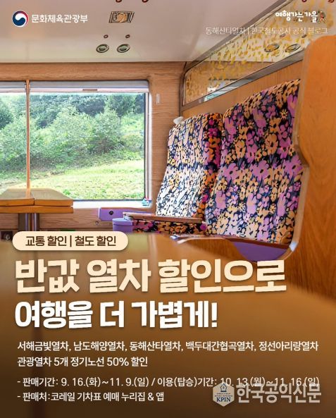 서해금빛열차, 남도해양열차, 동해산타열차, 백두대간협곡열차, 정선아리랑열차 관광열차 5개 정기노선 50% 할인