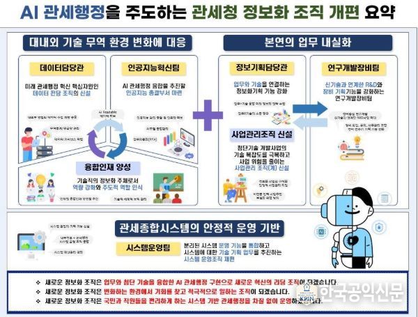 한국공익신문 관리자 기자 | 관세청은 ‘인공지능(AI)으로 공정 성장을 선도하는 관세청’이라는 새로운 비전을 실현하기 위해 9월 23일 기존 정보화 조직을 전면 개편했다고 밝혔다.