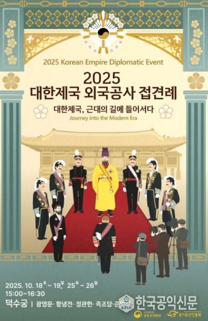 한국공익신문 관리자 기자 | 국가유산청 궁능유적본부는 국가유산진흥원과 함께 10월 18일~19일, 25일~26일 오후 3시 덕수궁(서울 중구)에서 고종 황제가 외국공사를 접견하는 의례와 연회를 재현한 공연 '2025년 대한제국 외국공사 접견례'를 개최한다.