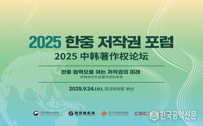 한국공익신문 관리자 기자 | 문화체육관광부는 한국저작권위원회, 중국 국가판권국과 함께 9월 24일, 파크하얏트 부산에서 ‘2025 한중 저작권 정부간회의(오전)’와 ‘2025 한중 저작권 포럼(오후)’을 열어 저작권 보호를 위한 양국 협력 방안과 인공지능(AI), 블록체인 등 기술 발전에 따른 저작권 정책 변화 및 대응을 논의한다.