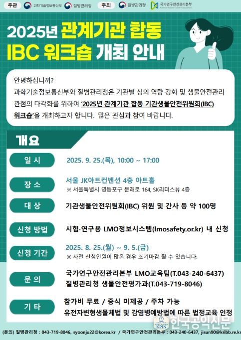 한국공익신문 관리자 기자 | 질병관리청은 유전자변형생물체 및 고위험병원체를 취급하는 기관의 자율적 생물안전 역량 강화를 위해 9월 25일 서울 JK아트컨벤션(서울 영등포구 소재)에서 '2025년 관계기관 합동 기관생물안전위원회 워크숍'을 개최한다고 밝혔다.