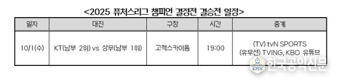 퓨처스리그 초대 챔피언이 결정될 결승전은 10월 1일(수) 오후 7시 고척스카이돔에서 열리며, 결승전은 TVING과 tvN SPORTS 및 KBO 유튜브를 통해 중계된다.