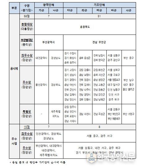 올해는 충청북도가 대통령상인 종합대상을, 부산광역시(광역자치단체 부분)와 전남 무안군(기초자치단체 부문)이 국무총리상인 부문별 대상을 받는 등 총 64개 자치단체가 수상의 영예를 안았다.