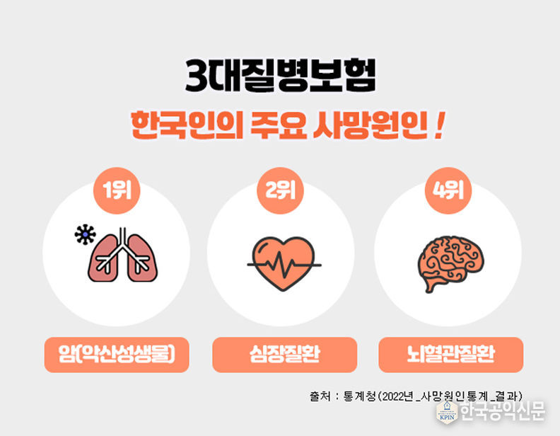 한국공익신문 관리자 기자 | 3대질병으로 일컬어지는 암, 뇌혈관질환, 심혈관질환은 한국인의 주요 사망원인에서 상위를 차지하고 있으며, 이에 대한 진단비를 집중적으로 보장해 주는 보험상품을 3대질병진단비 보험이라 할 수 있다.