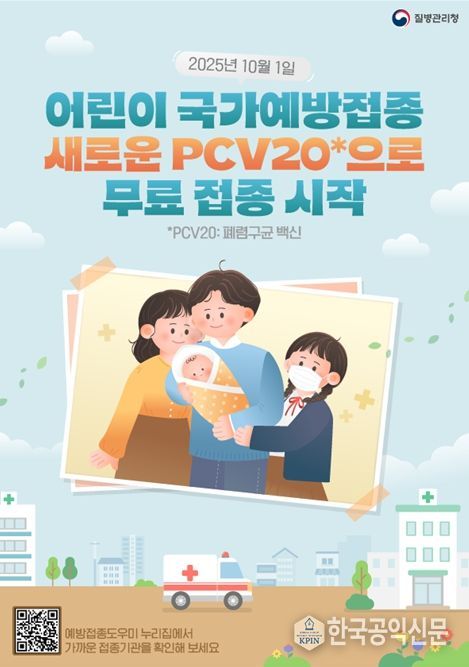 한국공익신문 관리자 기자 | 질병관리청은 10월 1일부터 폐렴구균 국가예방접종에 신규 백신인 20가 단백결합백신(PCV20)을 도입해 접종을 시작한다.