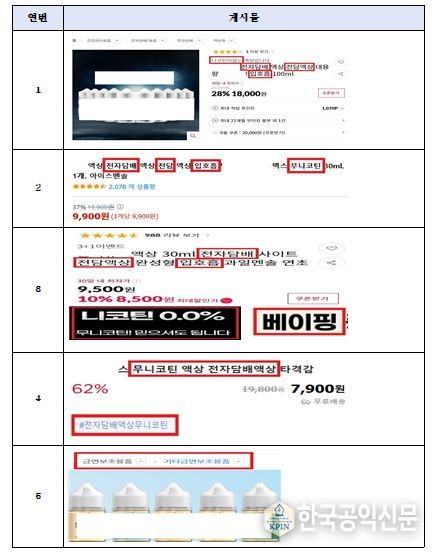 한국공익신문 관리자 기자 | 식품의약품안전처는 시중에서 판매되는 ‘무니코틴 표방 액상 흡입제품’에 대해 ‘의약외품(니코틴이 포함되지 않은 흡연욕구저하제, 흡연습관개선보조제)’ 오인 우려 광고로 보아 지난 9월 집중 점검을 실시했다.
