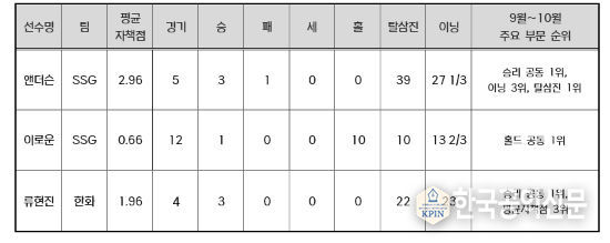 SSG 앤더슨은 9~10월 5경기에 선발 등판해 3승을 거두며 승리 부문 공동 1위에 올랐다. 평균자책점 2.96을 기록했고, 삼진 39개를 잡아내며 탈삼진 부문 월간 1위를 차지했다. 앤더슨은 9~10월 경기 당 평균 8개에 가까운 탈삼진을 잡으며 245탈삼진으로 정규시즌을 마무리했다.