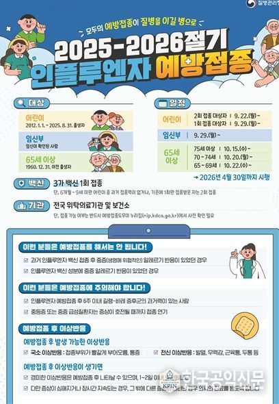 한국공익신문 관리자 기자 | 질병관리청은 10월 15일부터 65세 이상 어르신을 대상으로 ’25-’26절기 인플루엔자 예, 방접종을 실시하고, 코로나19 고위험군(65세 이상, 면역저하자 등)을 대상으로 ’25-’26절기 코로나19 예방접종을 실시한다.