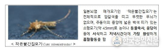 일본뇌염 매개모기인 작은빨간집모기는 암갈색 소형 모기로 주로 야간에 흡혈활동을 하고, 우리나라 전 지역에서 10월까지 활동하는 것으로 관찰된다. 일본뇌염 매개모기 감시 결과 9월말 기준(39주차) 평균 108개체로 지속적으로 발생하고 있으므로, 모기 물림에 주의하고, 증상 발현 시 신속하게 의료기관을 방문하여 진단 및 치료를 받아야 한다.