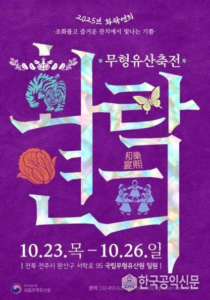 한국공익신문 관리자 기자 | 국가유산청 국립무형유산원(원장 박판용)은 10월 23일 오후 5시 개막식을 시작으로 26일까지 국립무형유산원(전북 전주시)에서 다양한 무형유산을 한 자리에서 경험할 수 있는 무형유산 종합축제 「2025년 무형유산축전, ‘화락연희’」를 개최한다.