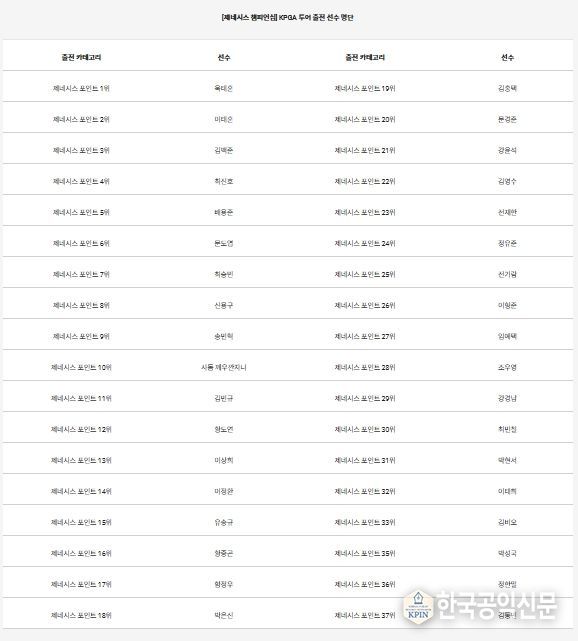 제네시스 포인트 1위 옥태훈(27.금강주택)을 비롯해 2위 이태훈(35.캐나다), 3위 김백준(24.속초아이), 4위 최진호(41.COWELL), 5위 배용준(25.CJ), 6위 문도엽(34.DB손해보험), 7위 최승빈(24.CJ), 8위 신용구(34.금강주택), 9위 송민혁(21.CJ), 10위 사돔 깨우깐자나(27.태국)까지 제네시스 포인트 TOP10 선수들과 36위 정한밀(34.경희), 37위 김동민(27.NH농협은행)까지 제네시스 포인트 상위 36명이 참가자 명단에 이름을 올렸다.
