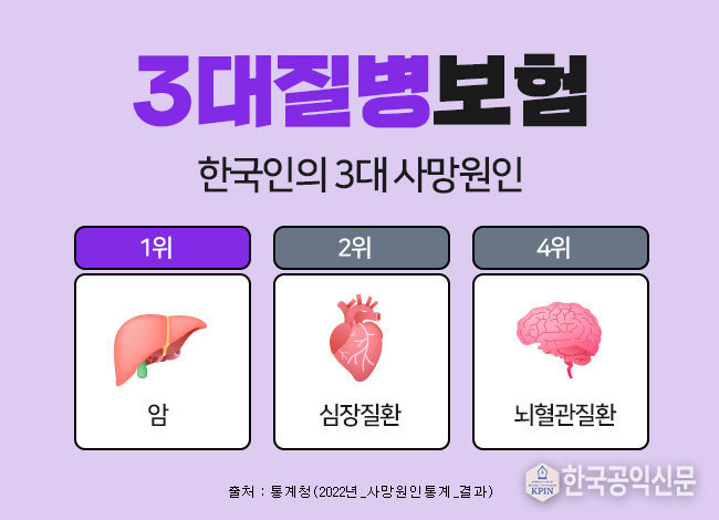 한국공익신문 관리자 기자 | 3대질병으로 일컬어지는 암, 뇌혈관질환, 심혈관질환은 한국인의 주요 사망원인에서 상위를 차지하고 있으며, 이에 대한 진단비를 집중적으로 보장해 주는 보험상품을 3대질병진단비 보험이라 할 수 있다.