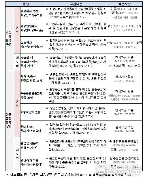 정부는 중증·응급의료체계 유지와 진료 공백 최소화를 위해 건강보험에서 10가지 항목을 지원했으며, 이 중 4개 항목은 그간 ‘25년 병·의원 상대가치점수 연계·조정, 상급종합병원 구조전환 시범사업(’24.10~) 및 포괄 2차 종합병원 지원사업(’25.7.~) 추진 등과 연계하여 정규수가 전환 또는 지원 종료 등 이미 조정된 바 있다.