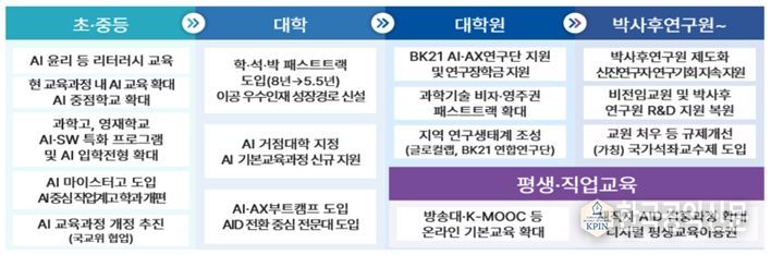초‧중등 학생‧학부모 등을 대상으로 인공지능(AI) 교육을 실시하는 인공지능(AI) 교육지원센터를 2026년 3개 교육청에 우선 설립하고, 2028년까지 전국 17개 시‧도교육청 전체에 확대할 계획이다. 시‧도교육청-대학-기업이 함께 학교 인공지능(AI) 교육을 지원하도록 협력 체계 구축을 지원하며, 특히 학생들에게 다양한 인공지능(AI) 진로체험 기회를 제공할 예정이다.