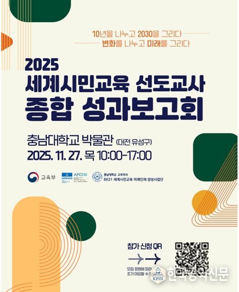 한국공익신문 관리자 기자 | 교육부는 유네스코아시아태평양국제이해교육원(원장 임현묵)과 함께 11월 27일 충남대학교 박물관에서 2025년 세계시민교육 선도교사 종합 성과보고회를 개최한다.