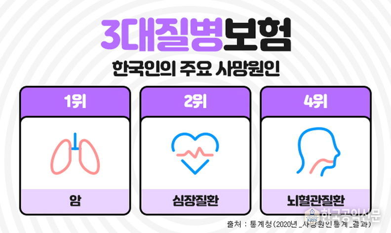 한국공익신문 관리자 기자 | 한국인의 주요 사망원인중에 암, 뇌혈관질환, 심혈관질환은 흔히 3대질병이라 일컬어지며 살아가면서 가장 먼저 대비해야 하는 중대질병으로 항상 강조되고 있다. 이들 질병에 미리 대비하기 위해 가입하는 것이 진단비보험인데, 이러한 3대질병진단비를 중점으로 보장하는 보장성보험이 3대진단비보험 이다. 3대질병진단비보험은 각각의 질병에 주목해서 보장하기도 하지만, 나에게 맞는 추가 특약을 잘 골라서 가입한다면 종합건강보험으로도 충분히 활용도가 높다.