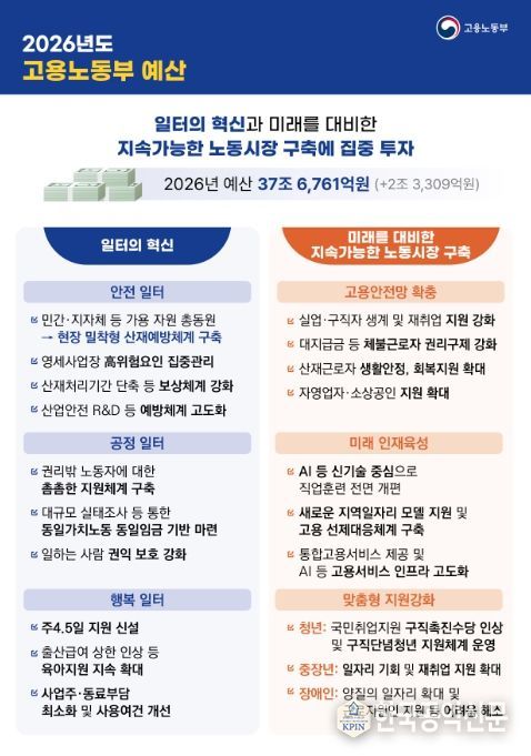 고용노동부는 2026년 예산을 일하는 사람의 생명과 안전을 최우선으로 보호하는 “안전 일터”, 일한 만큼 보상 받고 불합리한 차별이 없는 “공정 일터”, 장시간 근로하지 않고 일·가정 양립이 지켜지는 “행복 일터” 등 국민 삶의 근간이 되는 “일터의 혁신”에 집중 투자할 계획이다. 또한, 취약 노동자에 대한 고용안전망 확충, 인공지능(AI) 등 신기술 중심의 인재 양성, 청년·중장년·장애인의 특성을 고려한 맞춤형 지원 등 미래를 대비한 노동시장 구축에 투자를 확대한다.