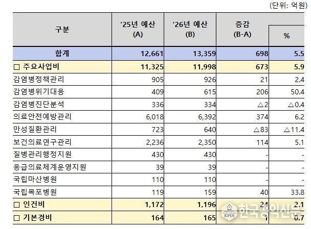 한국공익신문 관리자 기자 | 질병관리청은 2025년 12월 2일 국회 의결을 거쳐 2026년도 예산이 2025년(1조 2,661억원) 예산 대비 698억원(5.5%) 증액된 1조 3,359억 원으로 최종 확정됐다고 밝혔다.