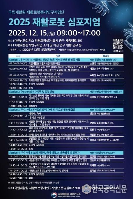 한국공익신문 관리자 기자 | 보건복지부 국립재활원은 12월 15일 대한상공회의소 의원회의실(서울 중구)에서 '2025 재활로봇 심포지엄'을 개최했다. 이번 행사는 국립재활원 재활로봇중개연구사업단에서 수행 중인 다양한 재활로봇중개연구를 소개하고 국내 재활로봇 연구 분야(산‧학‧연‧병) 연구자들이 연구 결과를 공유하면서 재활로봇중개사업을 확산하기 위한 목적으로 마련됐다.