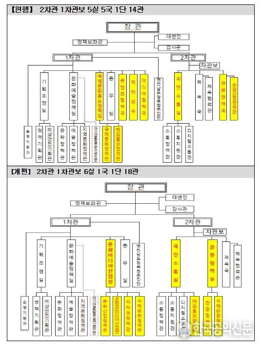 한국공익신문 관리자 기자 | 문화체육관광부는 ‘케이-컬처 300조 원, 케이-관광 3천만 명’을 달성하기 위해 ‘문화미디어산업실’과 ‘관광정책실’을 신설하고, 그 토대가 되는 문화예술 생태계를 탄탄하게 지원할 ‘예술인권리보호과’를 신설하는 등, 조직을 확대·개편한다.