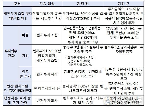 이를 통해 시장 상황을 반영하여 보다 유연한 투자 전략 수립이 가능해질 전망이다. 특히 초기투자 생태계의 주축을 이루는 개인투자조합과 창업 기획자의 활동 반경이 한층 넓어질 것으로 기대된다.