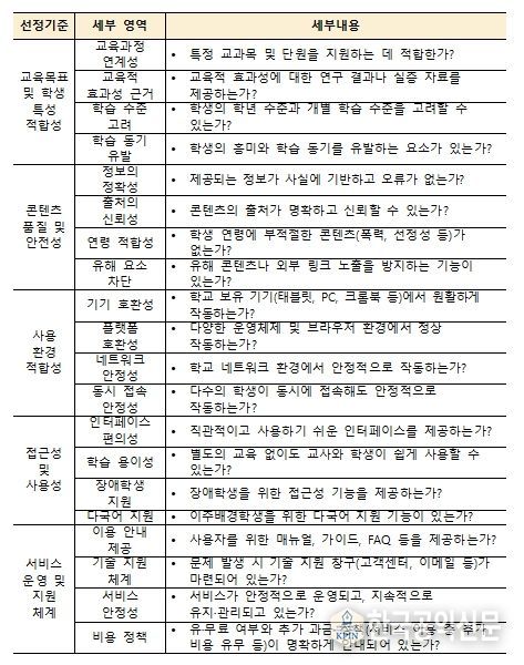 선택기준은 교육목표 적합성과 학교 사용환경 적합성과 같이 학습지원 소프트웨어의 교육적 효과성과 학교 활용 적합성 등을 판단하기 위한 기준으로 구성했다.