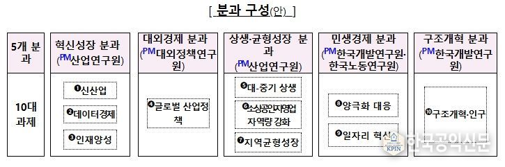 오늘 회의에서는 경인사연 소속 연구기관들이 집중 연구할 경제 대도약 10대 과제를 선별해 5개 분과로 편성하고 분과별 주관 연구기관(PM)을 지정했다. 아울러 연구 성과가 실제 정책으로 이어질 수 있도록 기재부를 중심으로 관계부처가 분과별 논의에 적극 참여해 연구기관들과 의견을 교환하도록 할 계획이다.