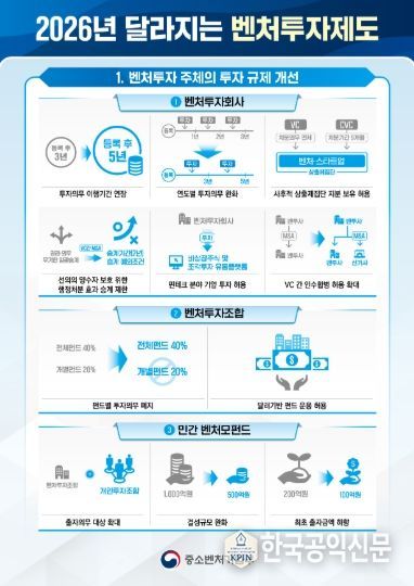 한국공익신문 관리자 기자 | 중소벤처기업부는 「벤처투자 촉진에 관한 법률」 및 하위법령(시행령, 시행규칙) 개정을 바탕으로 ’26년에 새롭게 달라지는 벤처투자 제도를 발표했다고 밝혔다.