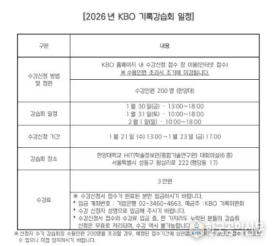 한국공익신문 관리자 기자 | 2026년 KBO 기록강습회가 1월 30일(금)부터 2월 1일(일)까지 서울 한양대학교에서 개최된다. 기록강습회는 야구 공식기록법의 보급과 이해를 통한 저변 확대를 목적으로 프로야구 원년인 1982년부터 개최됐다.