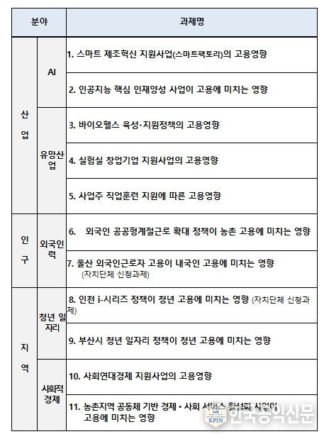 이날 회의에서는 2026년도 평가대상 후보과제에 대해서도 심의가 이뤄졌는데, 그간 고용 및 산업 전문가, 관계부처, 자치단체 등의 의견수렴 등을 거쳐 11개 후보과제가 발굴되었고, AI 등 유망산업분야(5개), 외국인 고용 등 인구구조분야(2개), 청년일자리・사회적 경제 등 지역정책분야(4개) 등 일자리에 영향을 미치는 주요 정책과제들로 확정되었다.
