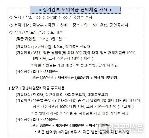 ‘장기간부 도약적금’ 사업은 군 간부 중 장기복무 선발자가 해당 적금에 가입하여 3년간 매월 일정한 금액을 납입 ( 월 최대 30만원 ) 하면 정부가 그에 100% 상응하는 금액을 지원하는 사업입니다. 적금 만기시에는 최대 약 2,315만원 수령이 가능하다. 가입은 2026년 3월 3일부터 가능하고, 대상은 2025년 12월 1일 이후 장기복무에 선발된 장교 및 부사관이다.