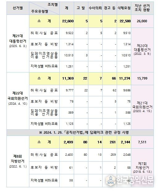 중앙선관위는 딥페이크 제작물이나 허위사실공표·비방 행위는 후보자에게 회복하기 어려운 피해를 줄 수 있고 유권자의 판단을 왜곡하여 선거결과에 영향을 미칠 수 있다면서, 깨끗한 사이버선거문화 조성을 위해 관계기관 등의 적극적인 협조를 요청했다.