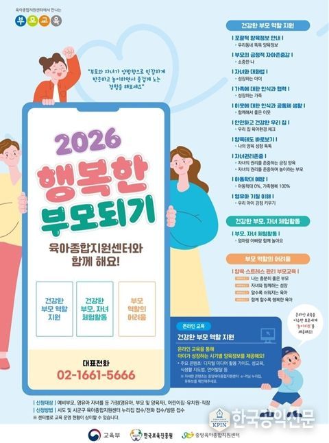 한국공익신문 관리자 기자 | 교육부는 중앙육아종합지원센터(센터장 조용남) 및 시도·시군구 육아종합지원센터와 협력하여 '2026년 공통 부모교육 사업'을 3월부터 연중 지속 운영한다고 밝혔다.