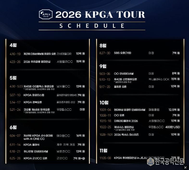 한국공익신문 관리자 기자 | ㈜한국프로골프투어(대표이사 김원섭, 이하 KPGT)가 3월 5일, 2026 시즌 KPGA 투어 일정을 발표했다.