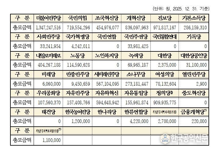 한국공익신문 관리자 기자 | 중앙선거관리위원회는 2025년도 중앙당후원회와 국회의원후원회의 후원금 모금내역을 집계한 결과, 37개의 중앙당(중앙당창당준비위원회 포함)후원회가 총 81억 7천8백여만 원을, 303개의 국회의원후원회가 총 608억 3천2백여만 원을 모금했다고 밝혔다.