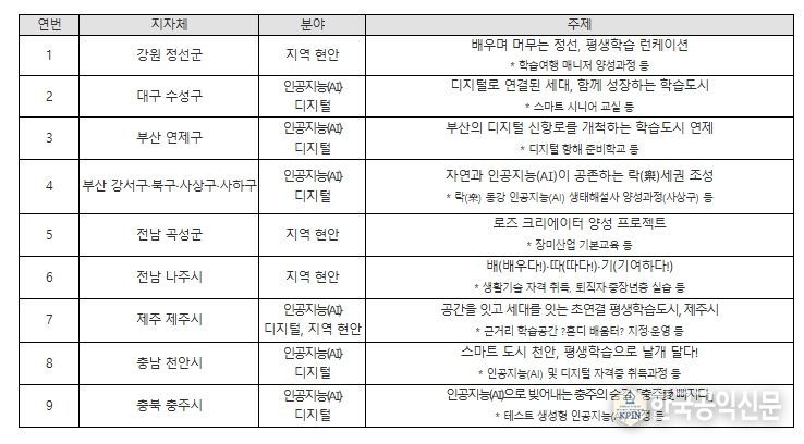 올해 교육부와 국가평생교육진흥원은 인공지능(AI) 대전환 시대 도래, 고령화·인구감소 등의 지역 현안 대응 등에 발맞춰, 기존 평생학습도시 201개(’25년 기준) 중 9개 평생학습도시를 지역의 색깔을 살린 ‘특성화 평생학습도시’로 거듭나도록 지원한다. 이번에 선정된 특성화 평생학습도시는 인공지능(AI)·디지털 학습, 지역 산업 참여, 세대 간 교류, 중장년 인재양성 등에 집중하여 평생교육을 지원할 계획이다.
