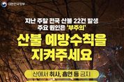 한국공익신문 관리자 기자 | 지난 주말 전국 산불 22건 발생 주요 원인은 '부주의' 산불 예방수칙을 지켜주세요 · 산에서 취사, 흡연 등 금지 · 산 근처에서 쓰레기 소각 금지 · 연기, 불씨 보면 119 신고 "불법소각, 꽁초 투기 등 위반 행위 엄정 대응" [뉴스출처 : 문화체육관광부]