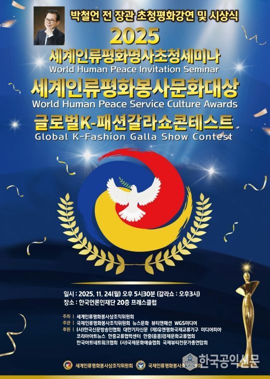 한국공익신문 관리자 기자 | ‘2025 세계인류평화명사초청세미나 및 세계인류평화봉사문화대상 시상식’이 오는 11월 24일 오후 5시 30분, 서울 태평로 한국언론재단 20층 프레스클럽에서 열린다.