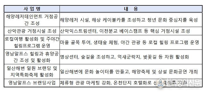 울산은 ‘일산해수욕장’ 등 해양자원과 ‘영남알프스’ 산악자원을 연계하여 ‘하루 더 머무는 체류형 복합레저도시’ 조성을 목표로 한다. 이를 통해, 제조업 중심의 산업구조를 고용친화적 관광산업으로 다변화하여 지역경제 활성화를 도모한다.