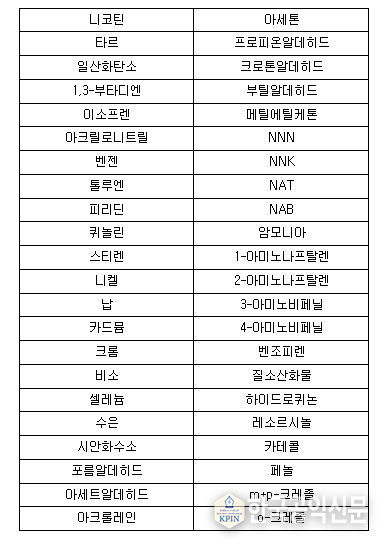 위원회는 검사의 대상이 되는 담배 유해성분 목록과 유해성분별 시험법도 의결했다. 이는 올해 행정예고(3월 6일부터 2개월)를 완료하고 현재 규제심사를 진행하고 있는'담배 유해성분 지정 등에 관한 규정'(식품의약품안전처고시)에 담겨 있다. ①유해성분의 경우, 궐련 및 궐련형 전자담배에 대하여는 타르 및 니코틴을 포함한 44종을, 액상형 전자담배에 대하여는 니코틴, 프로필렌글리콜, 글리세린 등 20종을 지정했다. ②시험법의 경우, 세계보건기구(World Health Organization, WHO), 국제표준화기구(International Organization for Standardization, ISO) 등 국제기구에서 개발된 표준시험법을 참고하여 마련했다.