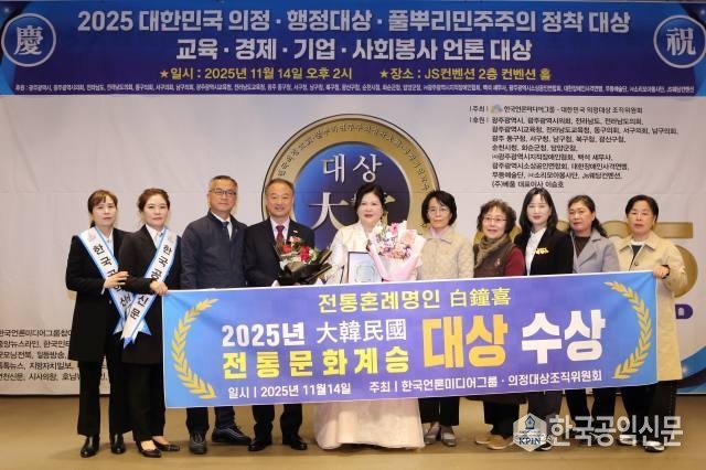 우리 고유의 예식문화를 보존하고 현대사회에 맞게 재해석하며 전통문화의 가치를 널리 알린 백종희(白宗熙) 명인이 지난 11월 14일 광주 JS컨벤션홀에서 열린 ‘제9회 대한민국 의정대상 및 풀뿌리 민주주의 정착대상 시상식’에서 ‘2025 대한민국 전통문화 대상’ 전통문화 계승 부문을 수상했다.